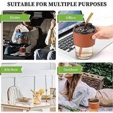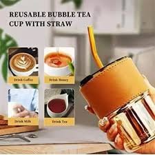 Buy Tumbler Mug with Lid and Glass Straw from Altutan. Stylish travel mug with anti-skid leather sleeve for hot and cold beverages like tea, coffee, smoothies and juice.